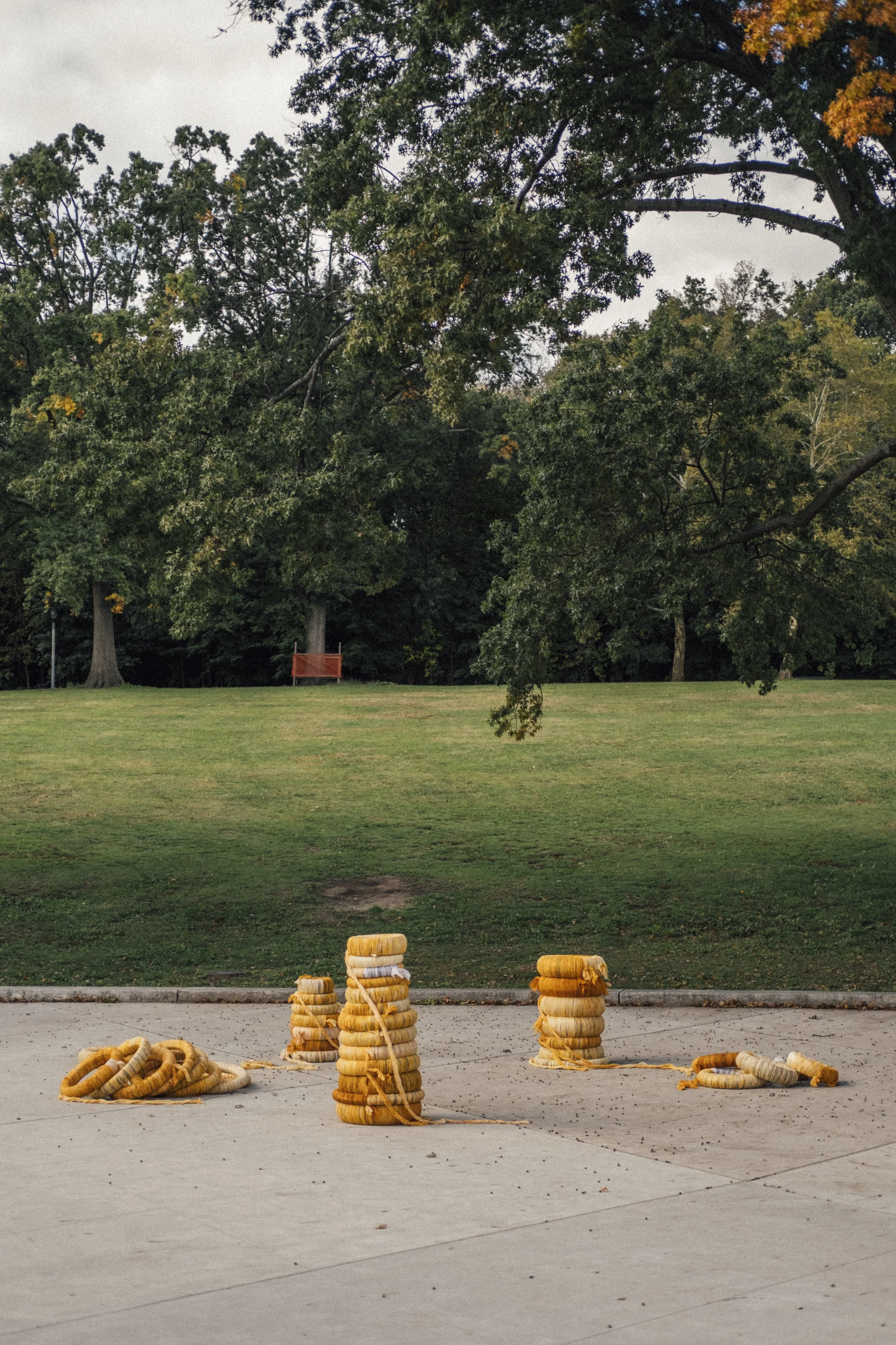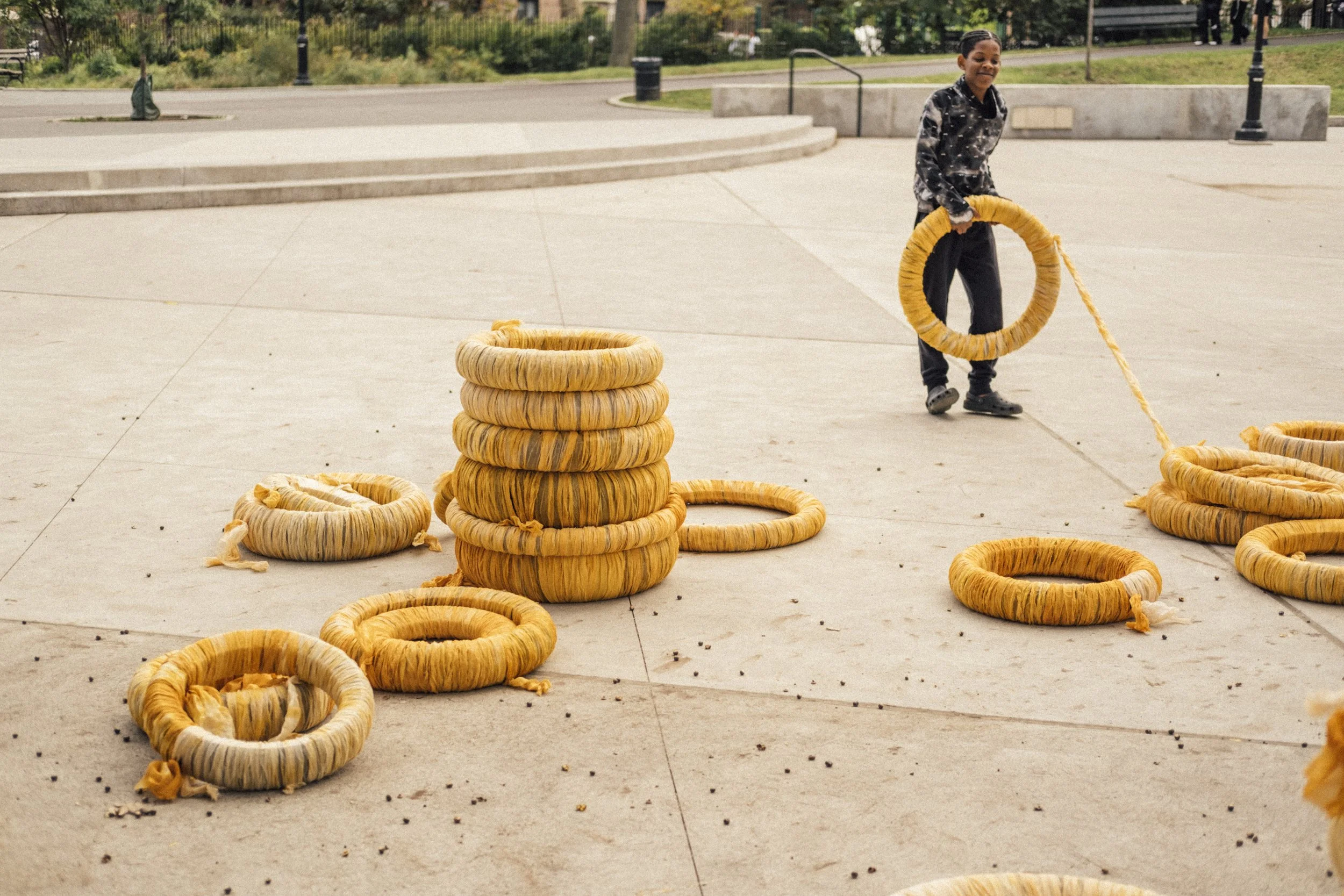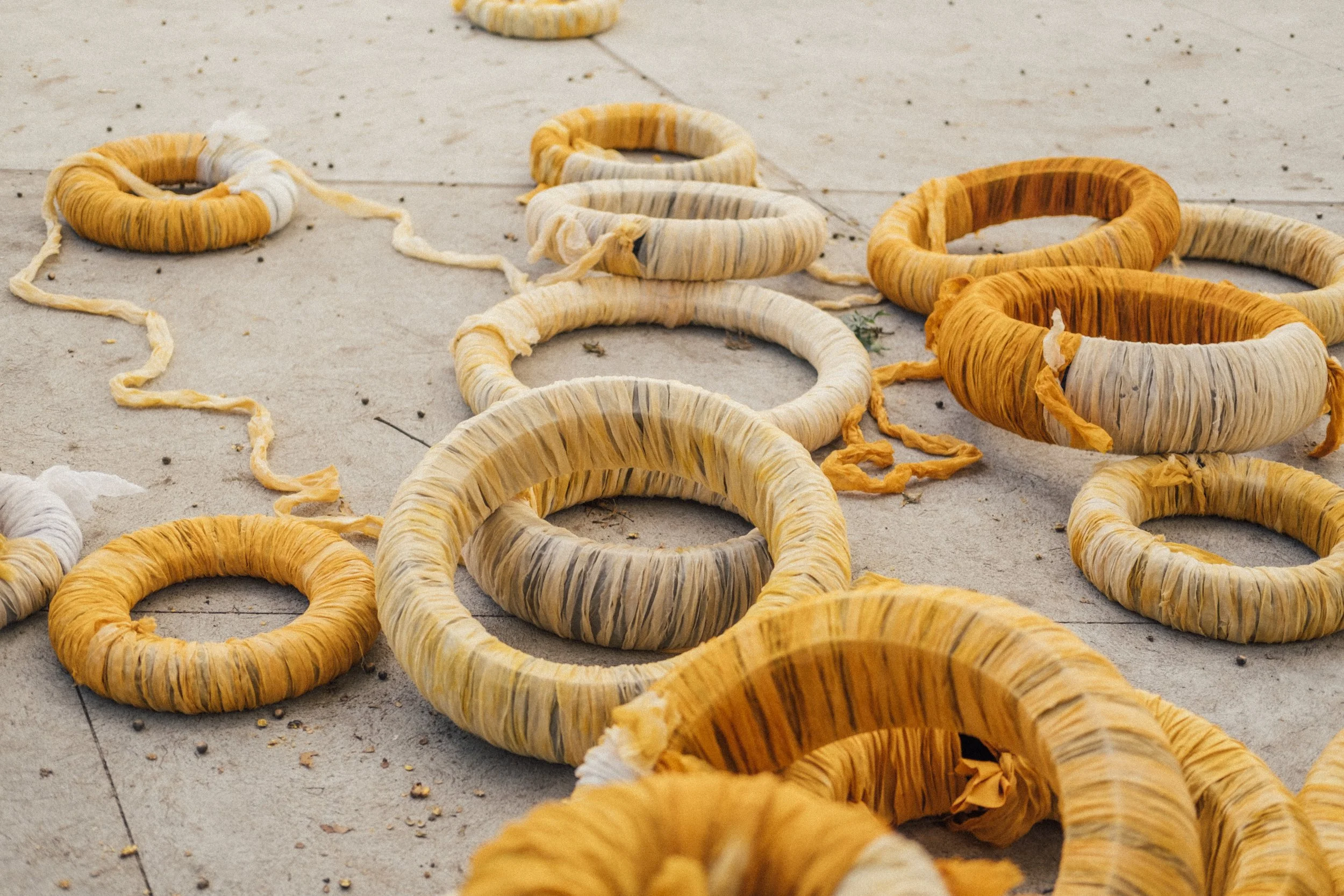 Participatory public-art installation at Highland Park. Tires gifted by a bike-repair shop owned by a Dominican family covered in fabrics dyed with seeds from onoto (achiote), an important plant in Latin American collective-consciousness.