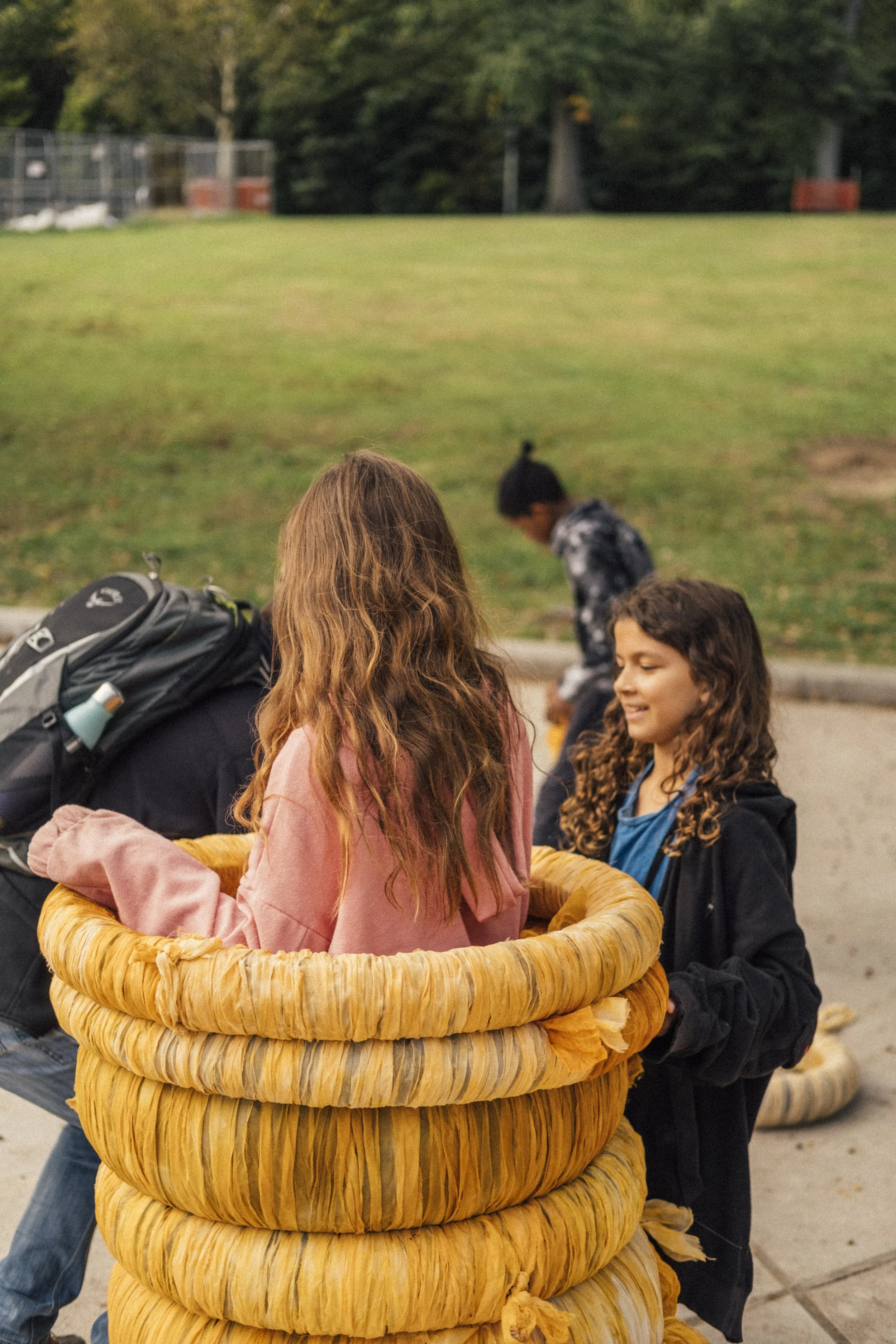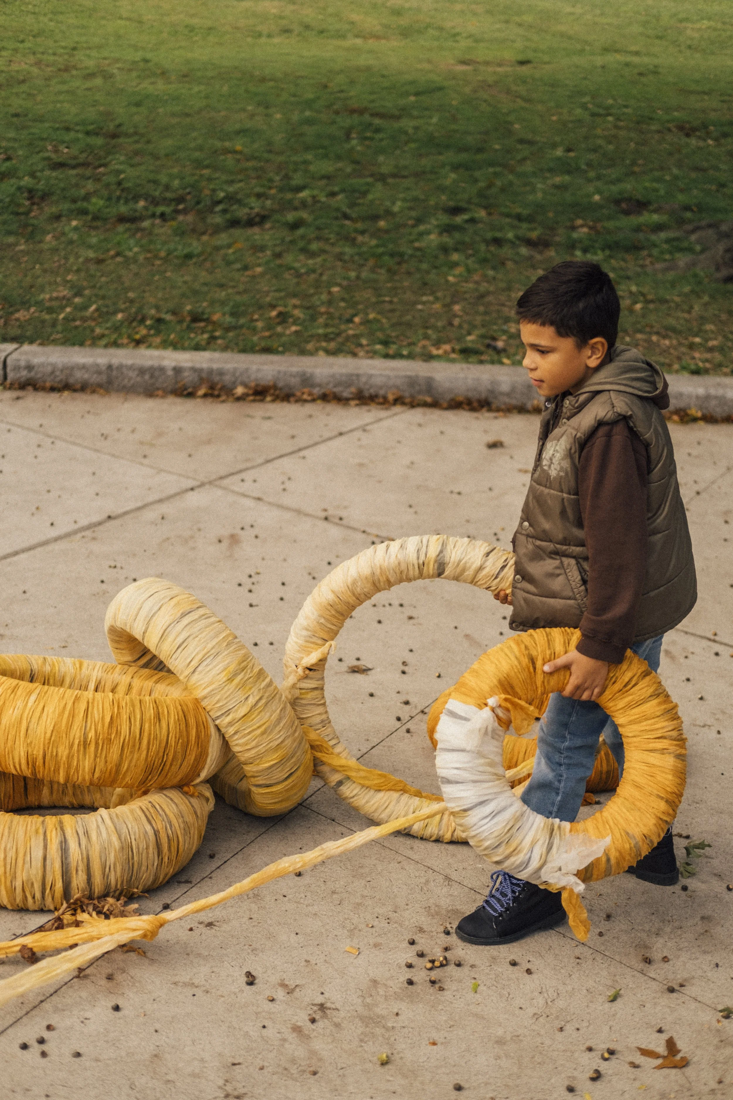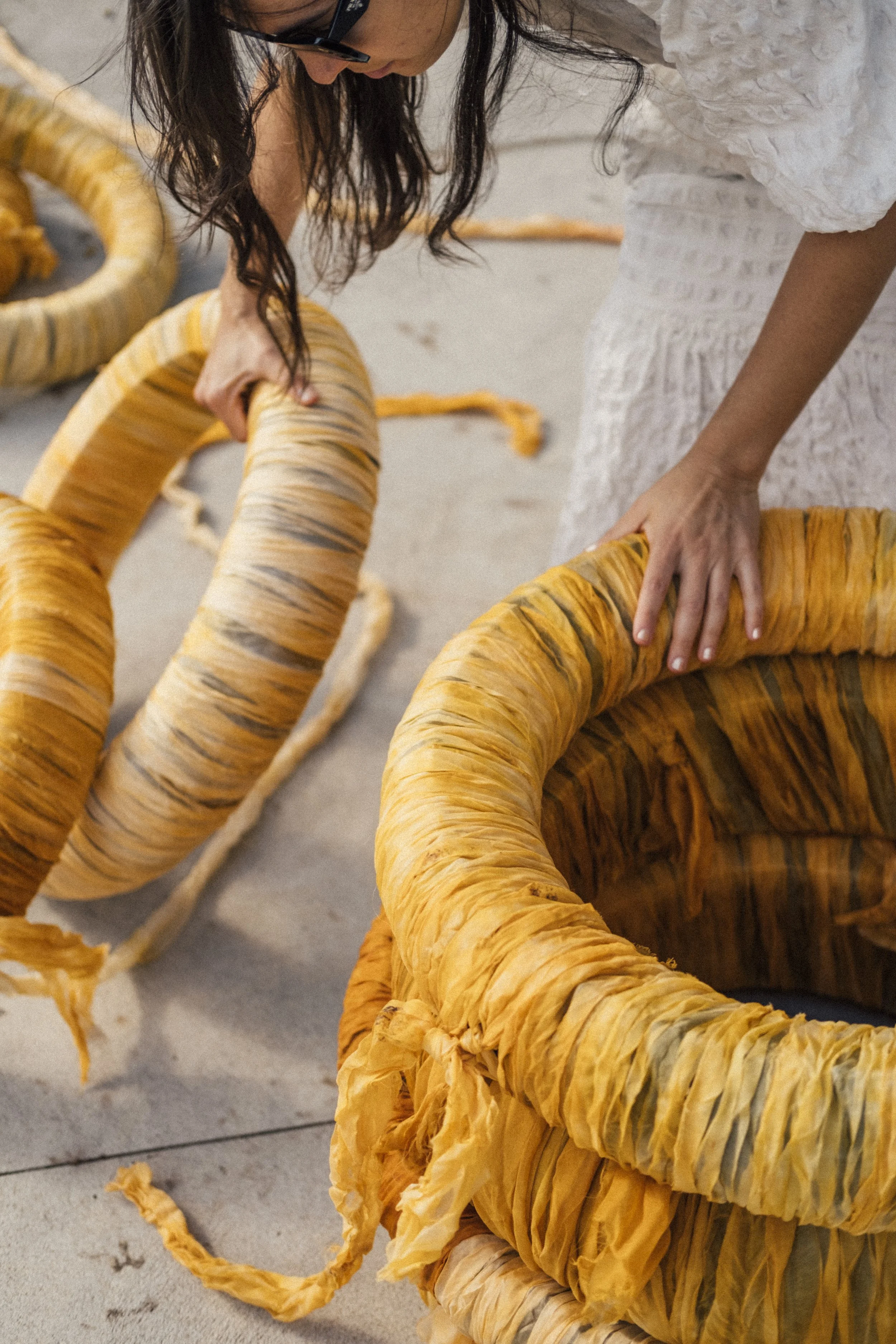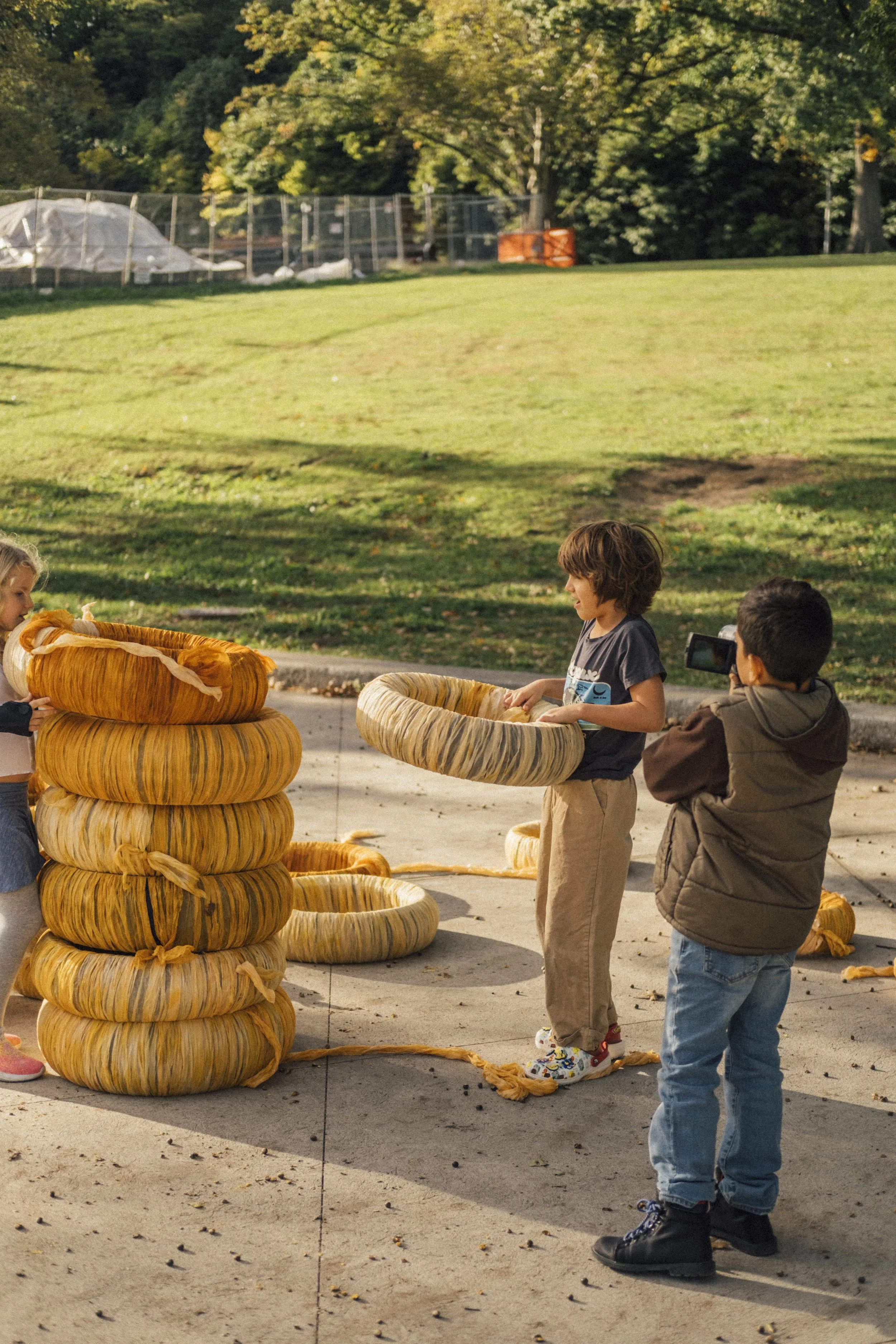 Participatory public-art installation at Highland Park. Tires gifted by a bike-repair shop owned by a Dominican family covered in fabrics dyed with seeds from onoto (achiote), an important plant in Latin American collective-consciousness.