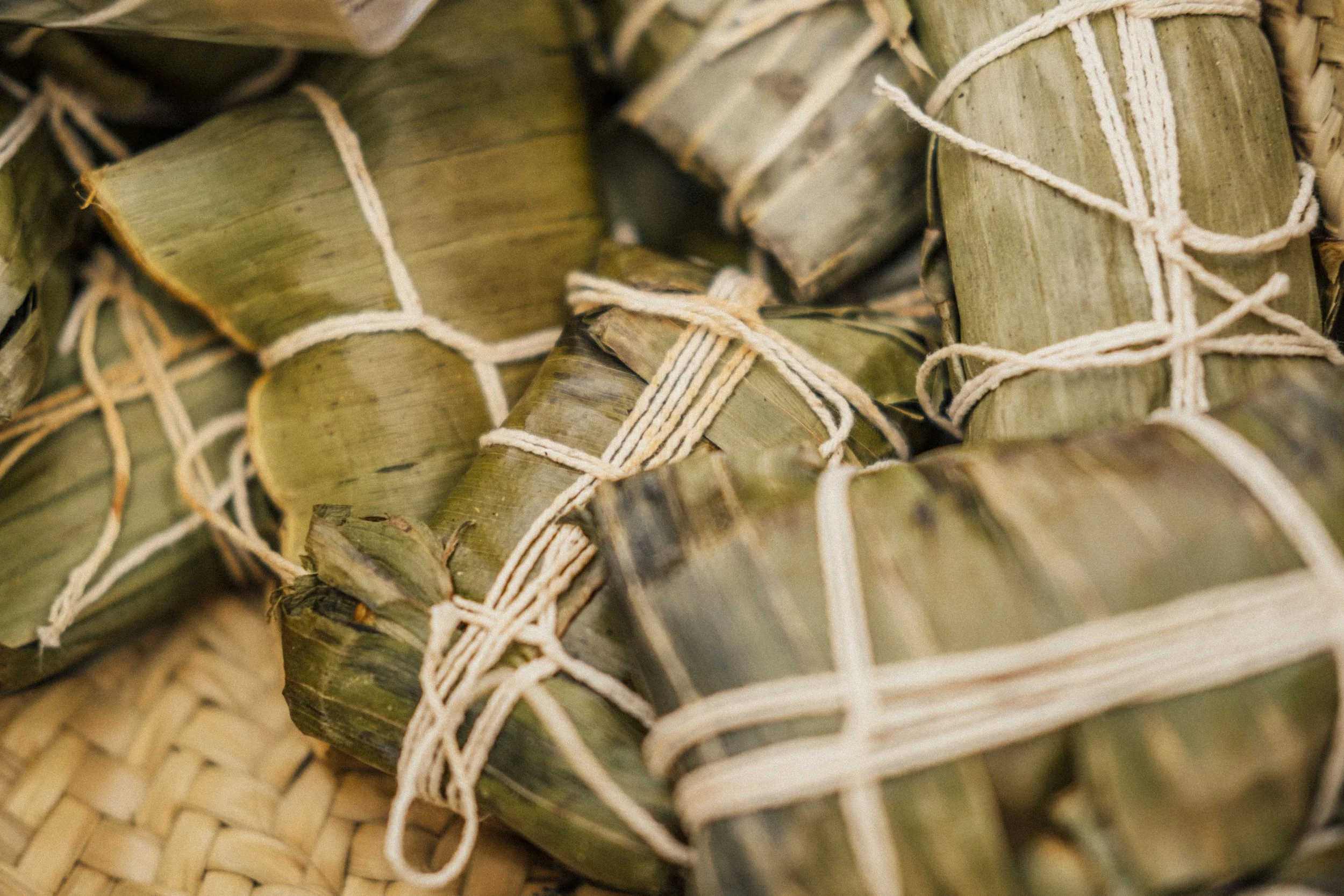Hallacas are prepared by families across Venezuela every year for Christmas in a dish that celebrates the country’s hybrid identity. Banana leaves wrap corn dough (dyed with onoto seeds) that contains a stew with multiple ingredients that depend on every family and region (capers, almonds, raisins, onion, pepper, chicken, pork, chicken, etc.). The ingredients represent, in order, the African, Indigenous, and Spanish heritage of the country.